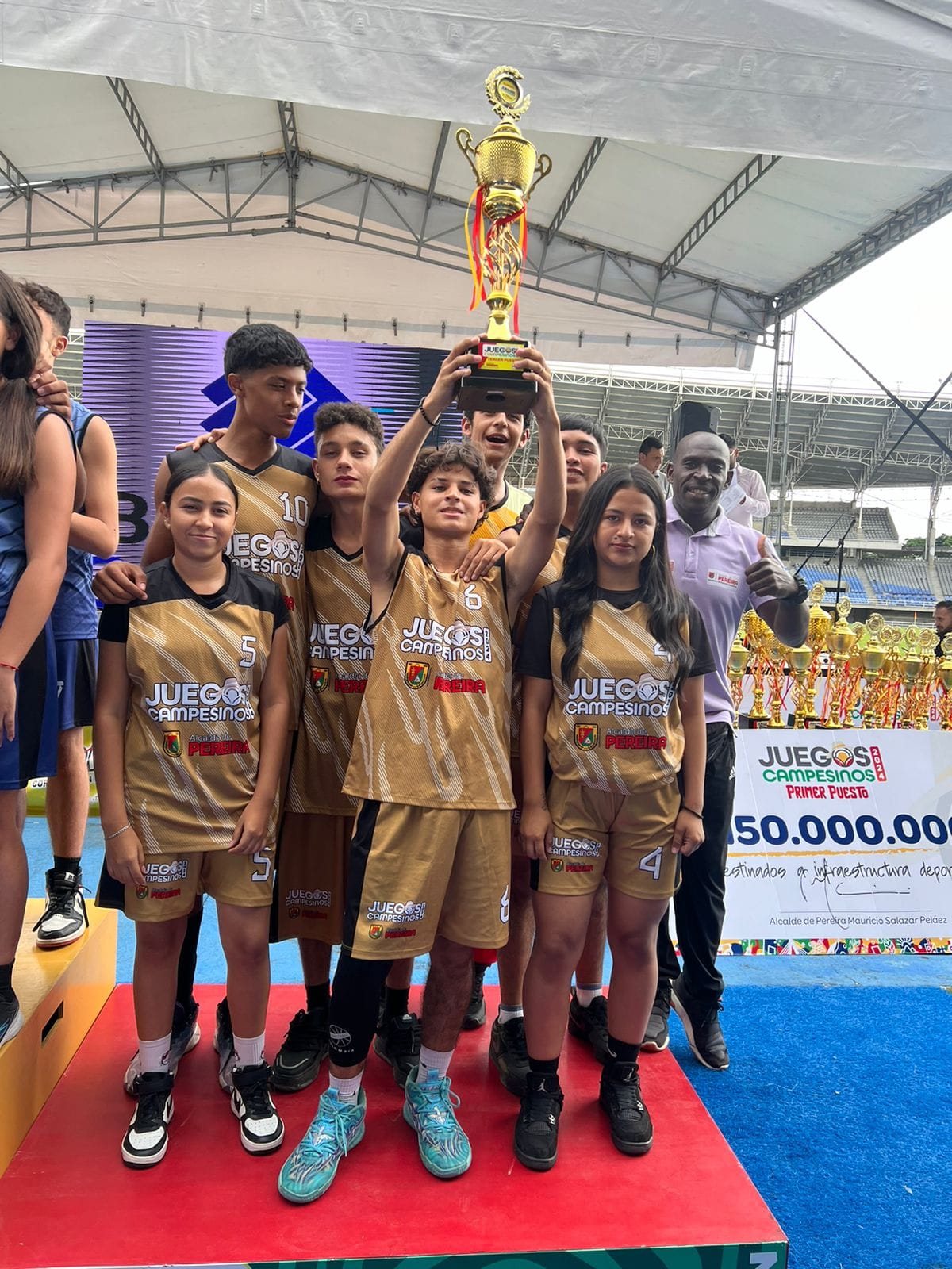 Equipo recibiendo su trofeo de TERCER PUESTO en los Juegos Municipales Campesinos de Pereira.